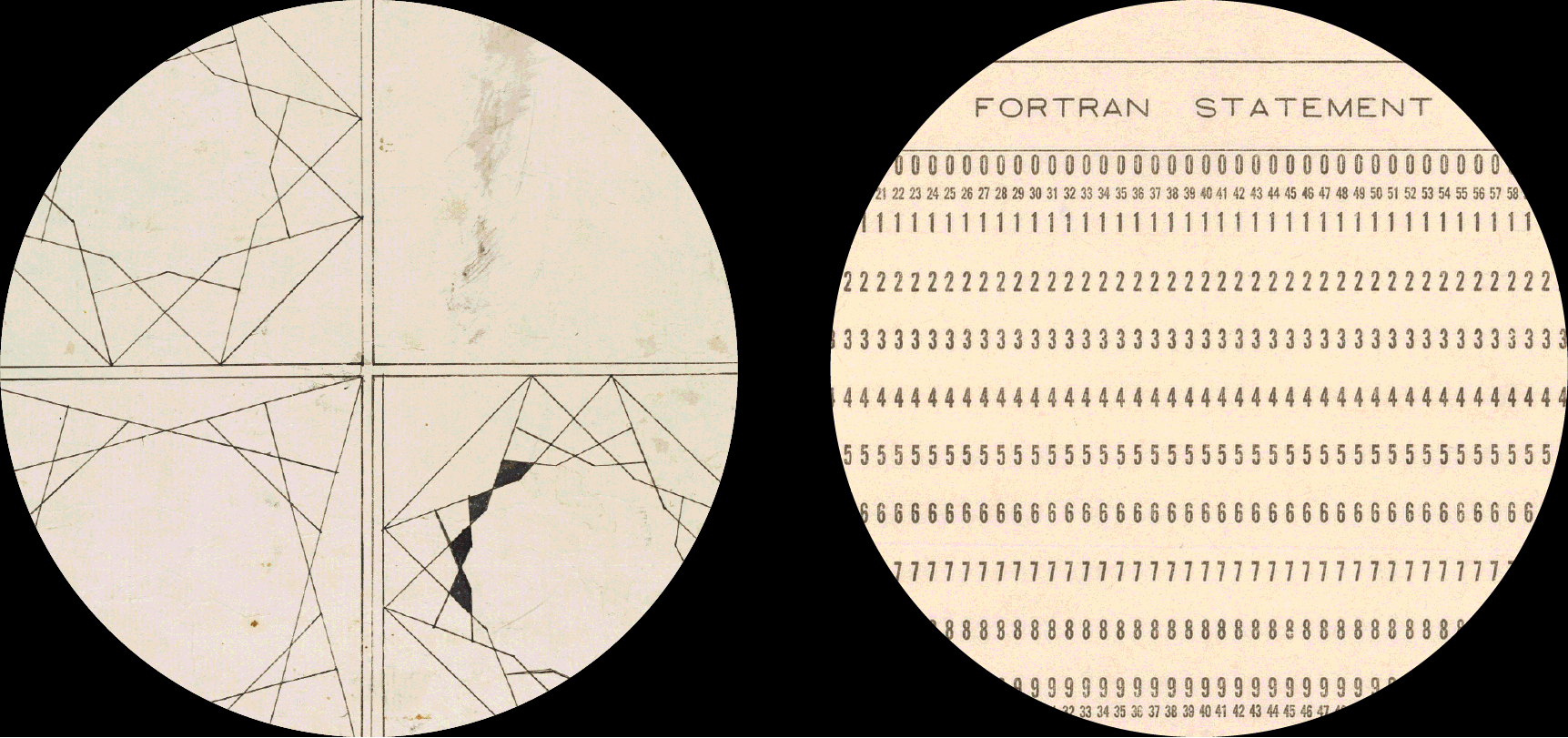 *compuational arts: fortran statement punch card, ortran explor code example by ken knowlton, pixillation by lillian schwartz and ken knowlton, theory of relativity by eduardo paolozzi, hemisphere by langheinrich, vega-köntösh by victor vasarely